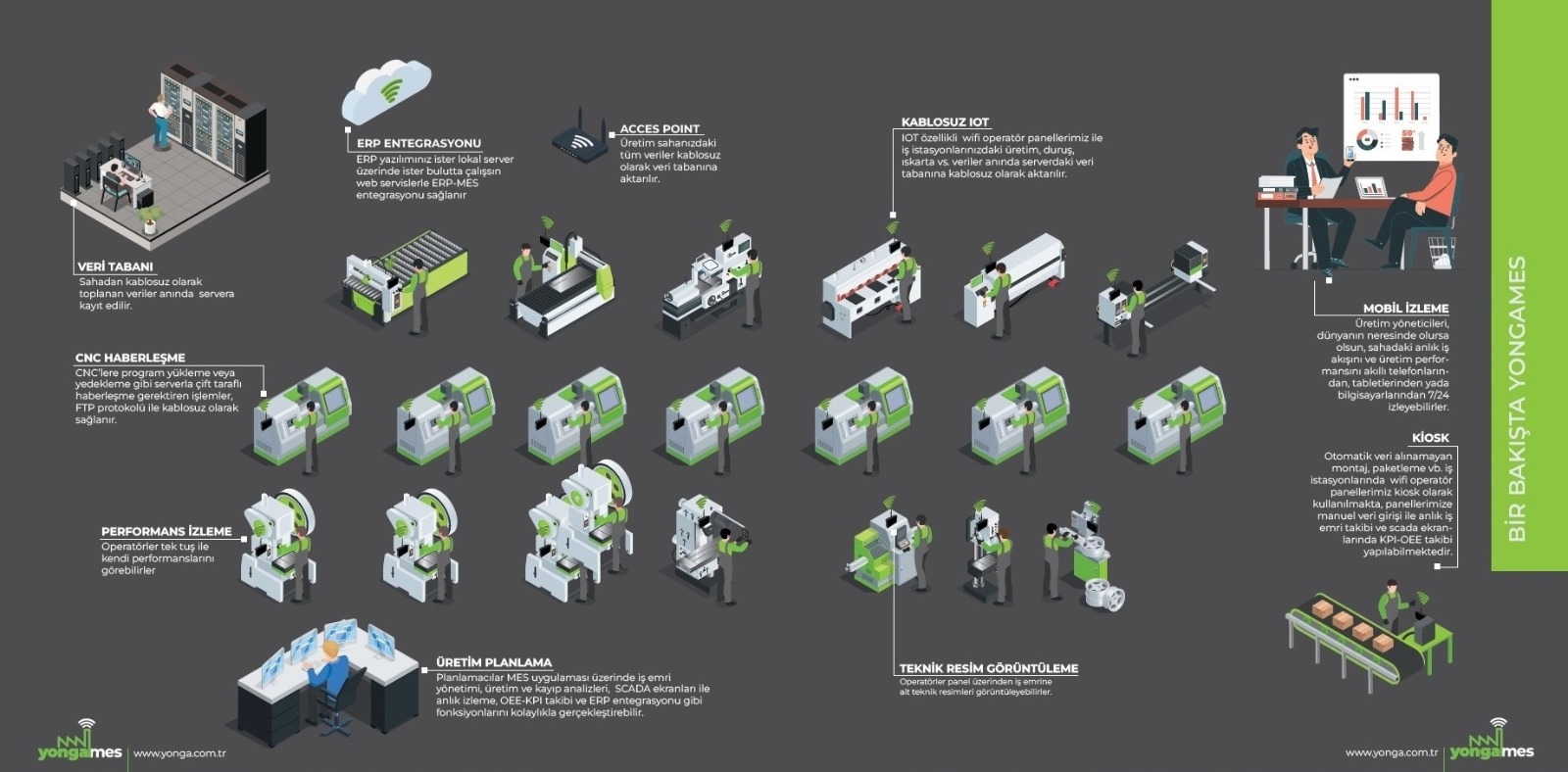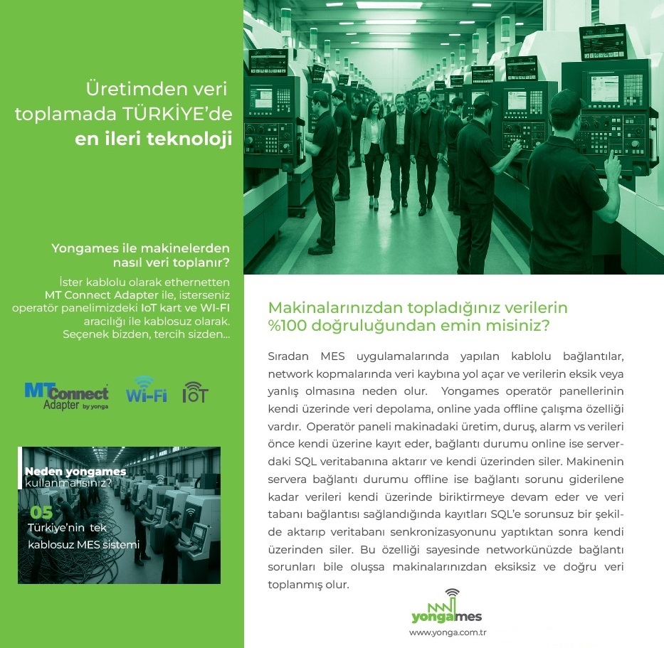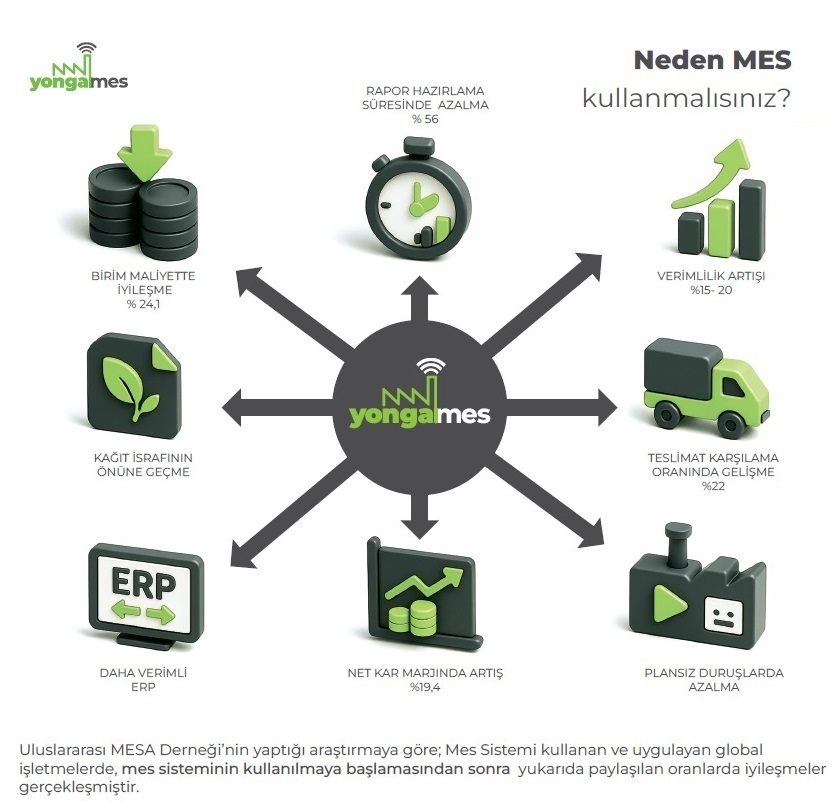 YongaMes raporlar modülü big data (büyük veri) analizleri ile çok ayrıntılı üretim emirlerinin detaylı analiz raporları ile birlikte makine ve operatör bazında üretim / duruş / arıza/ bakım / ıskarta ve geçmişe dönük ürün izleme raporları sayesinde sistemde oluşan kurumsal hafızayı ayrıntılı bir şekilde raporlar.